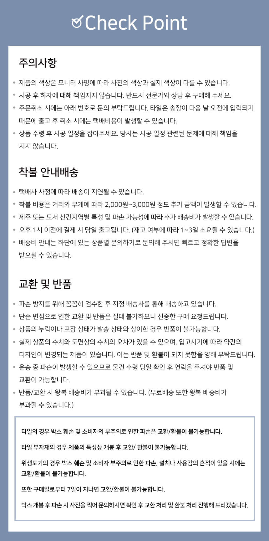 구매자 단순변심 : 상품 수령 후 7일 이내 (구매자 반품배송비 부담)