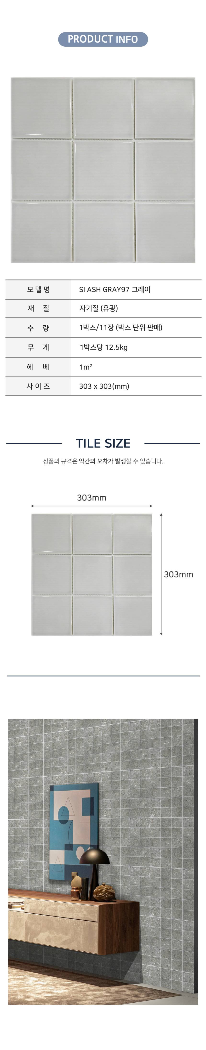 [모자이크타일] S97 SI ASH GRAY97 그레이 303X303 (1박스/11장) 유광
