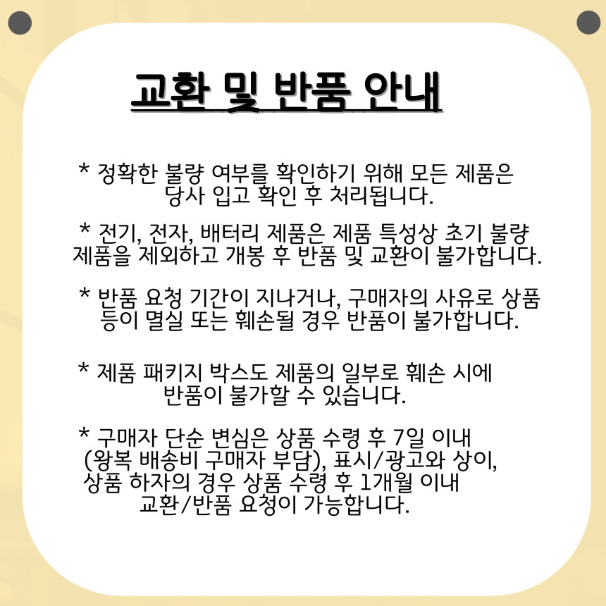 반품/교환에 관한 일반적인 사항은 판매자 제시사항보다 관계법령이 우선합니다.