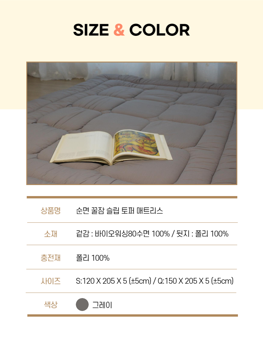 사이즈는 S : 120 X 205 X 5 (±5cm) 한가지 입니다.