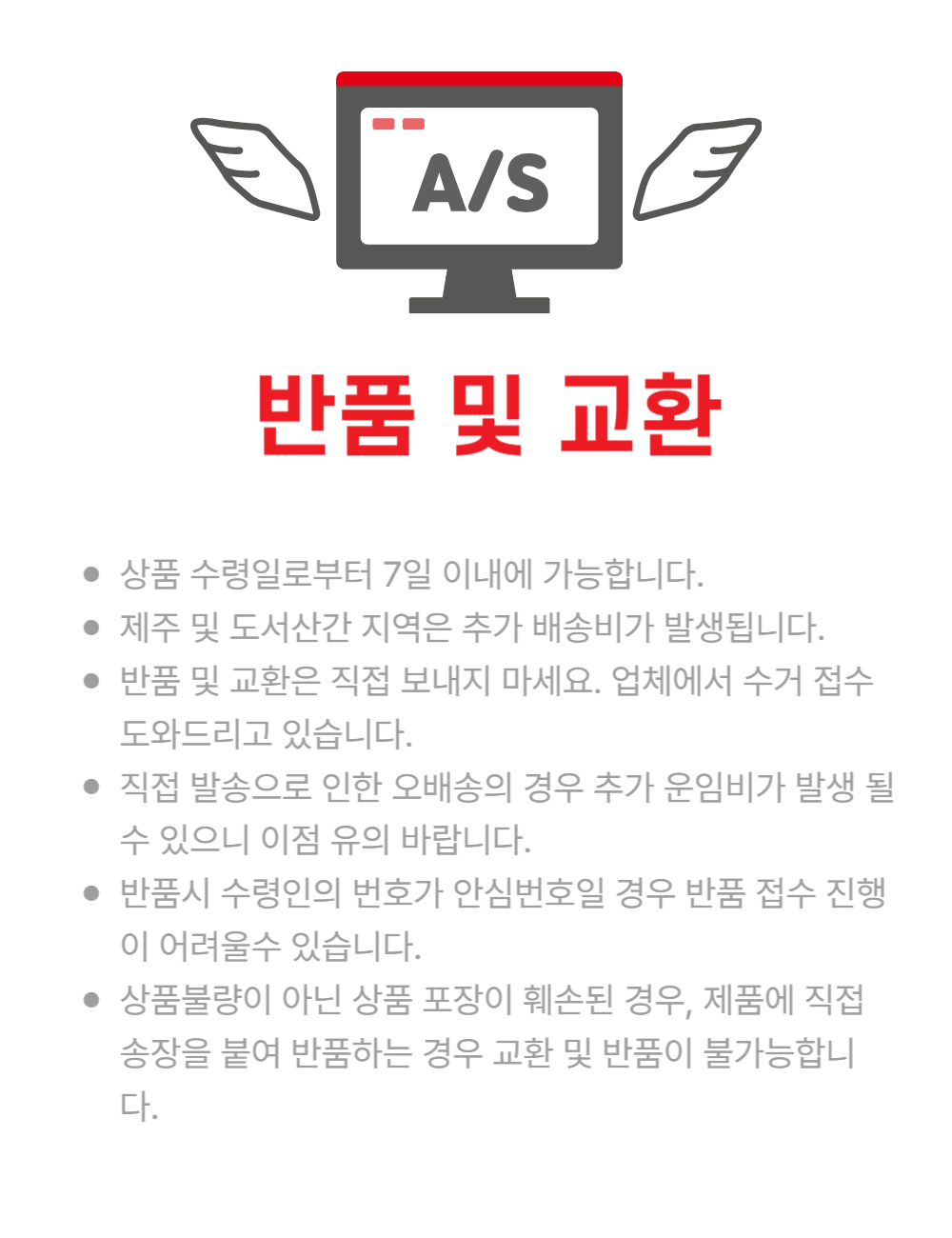구매자 단순변심 : 상품 수령 후 7일 이내 (구매자 반품배송비 부담)