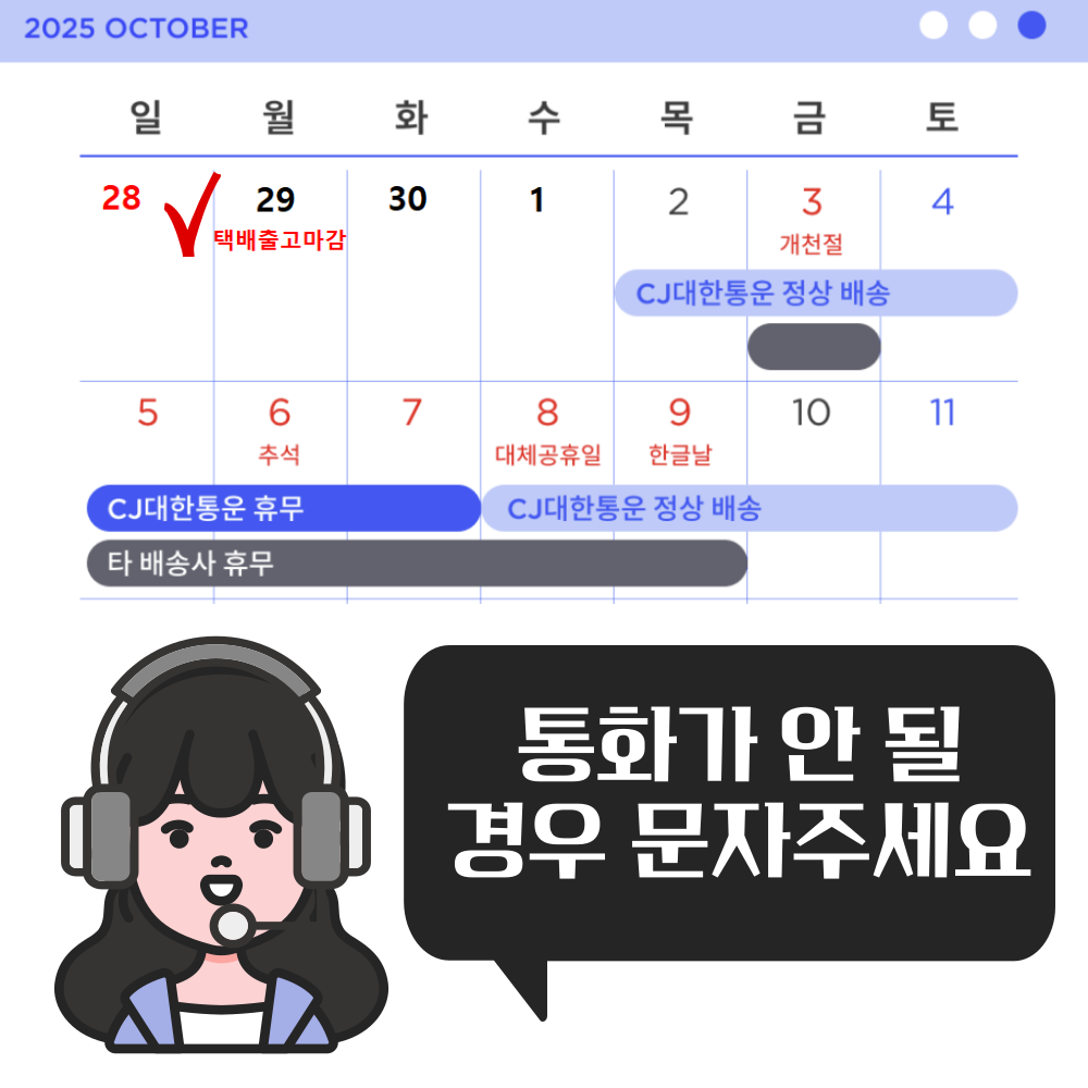 반품/교환에 관한 일반적인 사항은 판매자 제시사항보다 관계법령이 우선합니다. 반품배송비 : 편도 3,500원 교환배송비 : 왕복 7,000원 반품/교환 사유에 따른 요청 가능 기간 반품 시 먼저 판매자와 연락하셔서 반품사유, 택배사, 배송비, 반품지 주소 등을 협의하신 후 반품상품을 발송해 주시기 바랍니다. 구매자 단순변심 : 상품 수령 후 7일 이내 (구매자 반품배송비 부담) 표시/광고와 상이, 상품하자 : 상품 수령 후 3개월 이내 혹은 표시/광고와 다른 사실을 안 날로부터 30일 이내 (판매자 반품배송비 부담) 둘 중 하나 경과 시 반품/교환 불가 반품/교환 불가능 사유 아래와 같은 경우 반품/교환이 불가능합니다. 1. 반품요청기간이 지난 경우 2. 구매자의 책임 있는 사유로 상품 등이 멸실 또는 훼손된 경우(단, 상품의 내용을 확인하기 위하여 포장 등을 훼손한 경우는 제외) 3. 구매자의 책임있는 사유로 포장이 훼손되어 상품 가치가 현저히 상실된 경우 (예: 식품, 화장품, 향수류, 음반 등) 4. 구매자의 사용 또는 일부 소비에 의하여 상품의 가치가 현저히 감소한 경우 (라벨이 떨어진 의류 또는 태그가 떨어진 명품관 상품인 경우) 5. 시간의 경과에 의하여 재판매가 곤란할 정도로 상품 등의 가치가 현저히 감소한 경우 6. 고객의 요청사항에 맞춰 제작에 들어가는 맞춤제작상품의 경우 (판매자에게 회복불가능한 손해가 예상되고, 그러한 예정으로 청약철회권 행사가 불가하다는 사실을 서면 동의 받은 경우) 7. 복제가 가능한 상품 등의 포장을 훼손한 경우 (CD/DVD/GAME/도서의 경우 포장 개봉 시)