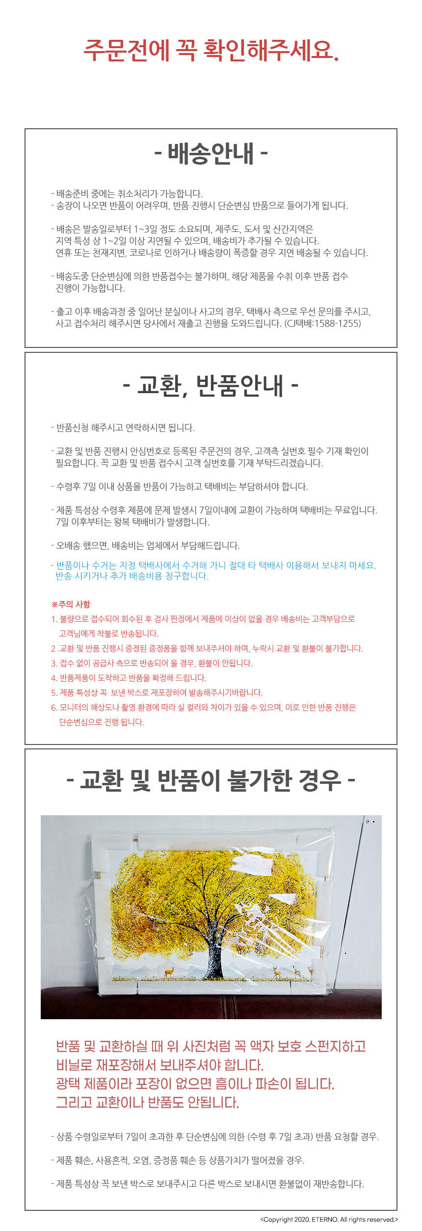 반품/교환에 관한 일반적인 사항은 판매자 제시사항보다 관계법령이 우선합니다. 반품배송비 : 편도 3,100원 교환배송비 : 왕복 6,200원 반품/교환 사유에 따른 요청 가능 기간 반품 시 먼저 판매자와 연락하셔서 반품사유, 택배사, 배송비, 반품지 주소 등을 협의하신 후 반품상품을 발송해 주시기 바랍니다. 구매자 단순변심 : 상품 수령 후 7일 이내 (구매자 반품배송비 부담) 표시/광고와 상이, 상품하자 : 상품 수령 후 3개월 이내 혹은 표시/광고와 다른 사실을 안 날로부터 30일 이내 (판매자 반품배송비 부담) 둘 중 하나 경과 시 반품/교환 불가 반품/교환 불가능 사유 아래와 같은 경우 반품/교환이 불가능합니다. 1. 반품요청기간이 지난 경우 2. 구매자의 책임 있는 사유로 상품 등이 멸실 또는 훼손된 경우(단, 상품의 내용을 확인하기 위하여 포장 등을 훼손한 경우는 제외) 3. 구매자의 책임있는 사유로 포장이 훼손되어 상품 가치가 현저히 상실된 경우 (예: 식품, 화장품, 향수류, 음반 등) 4. 구매자의 사용 또는 일부 소비에 의하여 상품의 가치가 현저히 감소한 경우 (라벨이 떨어진 의류 또는 태그가 떨어진 명품관 상품인 경우) 5. 시간의 경과에 의하여 재판매가 곤란할 정도로 상품 등의 가치가 현저히 감소한 경우 6. 고객의 요청사항에 맞춰 제작에 들어가는 맞춤제작상품의 경우 (판매자에게 회복불가능한 손해가 예상되고, 그러한 예정으로 청약철회권 행사가 불가하다는 사실을 서면 동의 받은 경우) 7. 복제가 가능한 상품 등의 포장을 훼손한 경우 (CD/DVD/GAME/도서의 경우 포장 개봉 시)