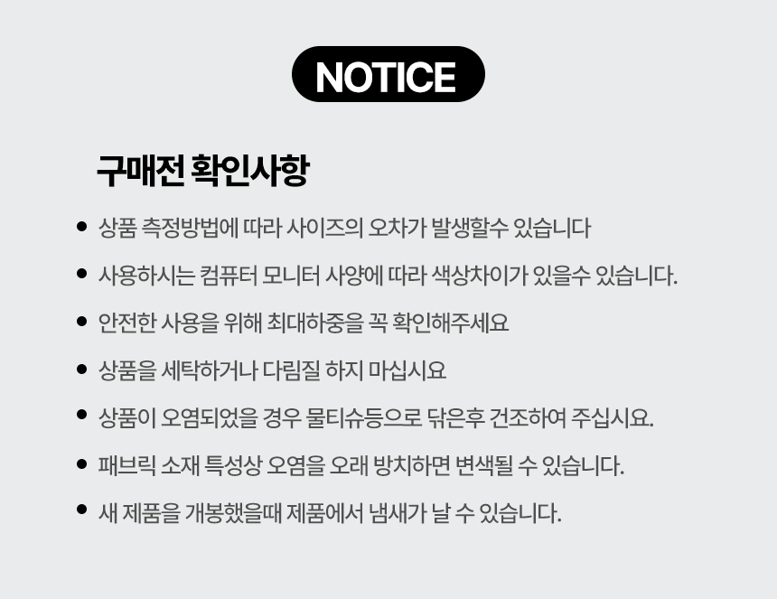 반품/교환에 관한 일반적인 사항은 판매자 제시사항보다 관계법령이 우선합니다. 반품배송비 : 편도 5,000원 교환배송비 : 왕복 10,000원 반품/교환 사유에 따른 요청 가능 기간 반품 시 먼저 판매자와 연락하셔서 반품사유, 택배사, 배송비, 반품지 주소 등을 협의하신 후 반품상품을 발송해 주시기 바랍니다. 구매자 단순변심 : 상품 수령 후 7일 이내 (구매자 반품배송비 부담) 표시/광고와 상이, 상품하자 : 상품 수령 후 3개월 이내 혹은 표시/광고와 다른 사실을 안 날로부터 30일 이내 (판매자 반품배송비 부담) 둘 중 하나 경과 시 반품/교환 불가 반품/교환 불가능 사유 아래와 같은 경우 반품/교환이 불가능합니다. 1. 반품요청기간이 지난 경우 2. 구매자의 책임 있는 사유로 상품 등이 멸실 또는 훼손된 경우(단, 상품의 내용을 확인하기 위하여 포장 등을 훼손한 경우는 제외) 3. 구매자의 책임있는 사유로 포장이 훼손되어 상품 가치가 현저히 상실된 경우 (예: 식품, 화장품, 향수류, 음반 등) 4. 구매자의 사용 또는 일부 소비에 의하여 상품의 가치가 현저히 감소한 경우 (라벨이 떨어진 의류 또는 태그가 떨어진 명품관 상품인 경우) 5. 시간의 경과에 의하여 재판매가 곤란할 정도로 상품 등의 가치가 현저히 감소한 경우 6. 고객의 요청사항에 맞춰 제작에 들어가는 맞춤제작상품의 경우 (판매자에게 회복불가능한 손해가 예상되고, 그러한 예정으로 청약철회권 행사가 불가하다는 사실을 서면 동의 받은 경우) 7. 복제가 가능한 상품 등의 포장을 훼손한 경우 (CD/DVD/GAME/도서의 경우 포장 개봉 시)