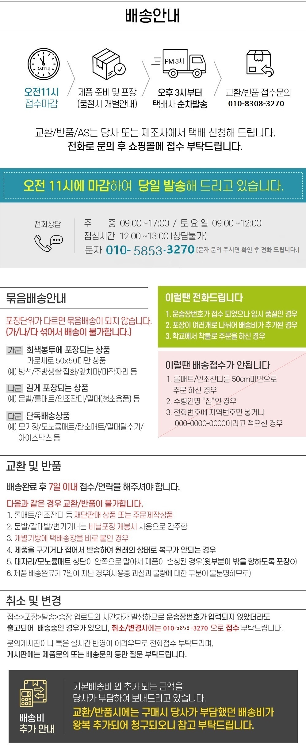 반품/교환에 관한 일반적인 사항은 판매자 제시사항보다 관계법령이 우선합니다. 반품배송비 : 편도 3,500원 교환배송비 : 왕복 7,000원 반품/교환 사유에 따른 요청 가능 기간 반품 시 먼저 판매자와 연락하셔서 반품사유, 택배사, 배송비, 반품지 주소 등을 협의하신 후 반품상품을 발송해 주시기 바랍니다. 구매자 단순변심 : 상품 수령 후 7일 이내 (구매자 반품배송비 부담) 표시/광고와 상이, 상품하자 : 상품 수령 후 3개월 이내 혹은 표시/광고와 다른 사실을 안 날로부터 30일 이내 (판매자 반품배송비 부담) 둘 중 하나 경과 시 반품/교환 불가 반품/교환 불가능 사유 아래와 같은 경우 반품/교환이 불가능합니다. 1. 반품요청기간이 지난 경우 2. 구매자의 책임 있는 사유로 상품 등이 멸실 또는 훼손된 경우(단, 상품의 내용을 확인하기 위하여 포장 등을 훼손한 경우는 제외) 3. 구매자의 책임있는 사유로 포장이 훼손되어 상품 가치가 현저히 상실된 경우 (예: 식품, 화장품, 향수류, 음반 등) 4. 구매자의 사용 또는 일부 소비에 의하여 상품의 가치가 현저히 감소한 경우 (라벨이 떨어진 의류 또는 태그가 떨어진 명품관 상품인 경우) 5. 시간의 경과에 의하여 재판매가 곤란할 정도로 상품 등의 가치가 현저히 감소한 경우 6. 고객의 요청사항에 맞춰 제작에 들어가는 맞춤제작상품의 경우 (판매자에게 회복불가능한 손해가 예상되고, 그러한 예정으로 청약철회권 행사가 불가하다는 사실을 서면 동의 받은 경우) 7. 복제가 가능한 상품 등의 포장을 훼손한 경우 (CD/DVD/GAME/도서의 경우 포장 개봉 시)