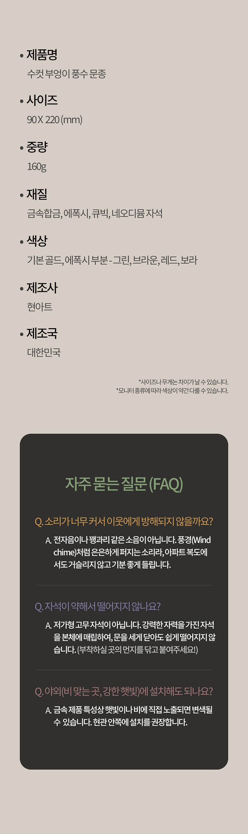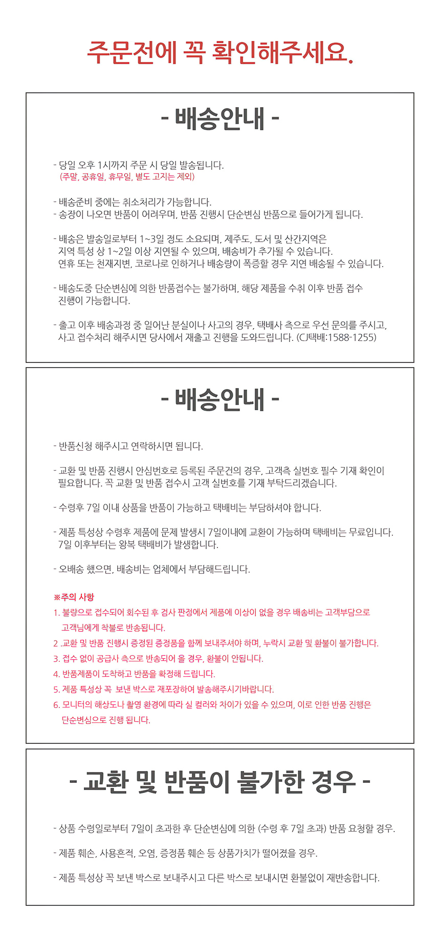 반품/교환에 관한 일반적인 사항은 판매자 제시사항보다 관계법령이 우선합니다. 반품배송비 : 편도 3,100원 교환배송비 : 왕복 6,200원 반품/교환 사유에 따른 요청 가능 기간 반품 시 먼저 판매자와 연락하셔서 반품사유, 택배사, 배송비, 반품지 주소 등을 협의하신 후 반품상품을 발송해 주시기 바랍니다. 구매자 단순변심 : 상품 수령 후 7일 이내 (구매자 반품배송비 부담) 표시/광고와 상이, 상품하자 : 상품 수령 후 3개월 이내 혹은 표시/광고와 다른 사실을 안 날로부터 30일 이내 (판매자 반품배송비 부담) 둘 중 하나 경과 시 반품/교환 불가 반품/교환 불가능 사유 아래와 같은 경우 반품/교환이 불가능합니다. 1. 반품요청기간이 지난 경우 2. 구매자의 책임 있는 사유로 상품 등이 멸실 또는 훼손된 경우(단, 상품의 내용을 확인하기 위하여 포장 등을 훼손한 경우는 제외) 3. 구매자의 책임있는 사유로 포장이 훼손되어 상품 가치가 현저히 상실된 경우 (예: 식품, 화장품, 향수류, 음반 등) 4. 구매자의 사용 또는 일부 소비에 의하여 상품의 가치가 현저히 감소한 경우 (라벨이 떨어진 의류 또는 태그가 떨어진 명품관 상품인 경우) 5. 시간의 경과에 의하여 재판매가 곤란할 정도로 상품 등의 가치가 현저히 감소한 경우 6. 고객의 요청사항에 맞춰 제작에 들어가는 맞춤제작상품의 경우 (판매자에게 회복불가능한 손해가 예상되고, 그러한 예정으로 청약철회권 행사가 불가하다는 사실을 서면 동의 받은 경우) 7. 복제가 가능한 상품 등의 포장을 훼손한 경우 (CD/DVD/GAME/도서의 경우 포장 개봉 시)