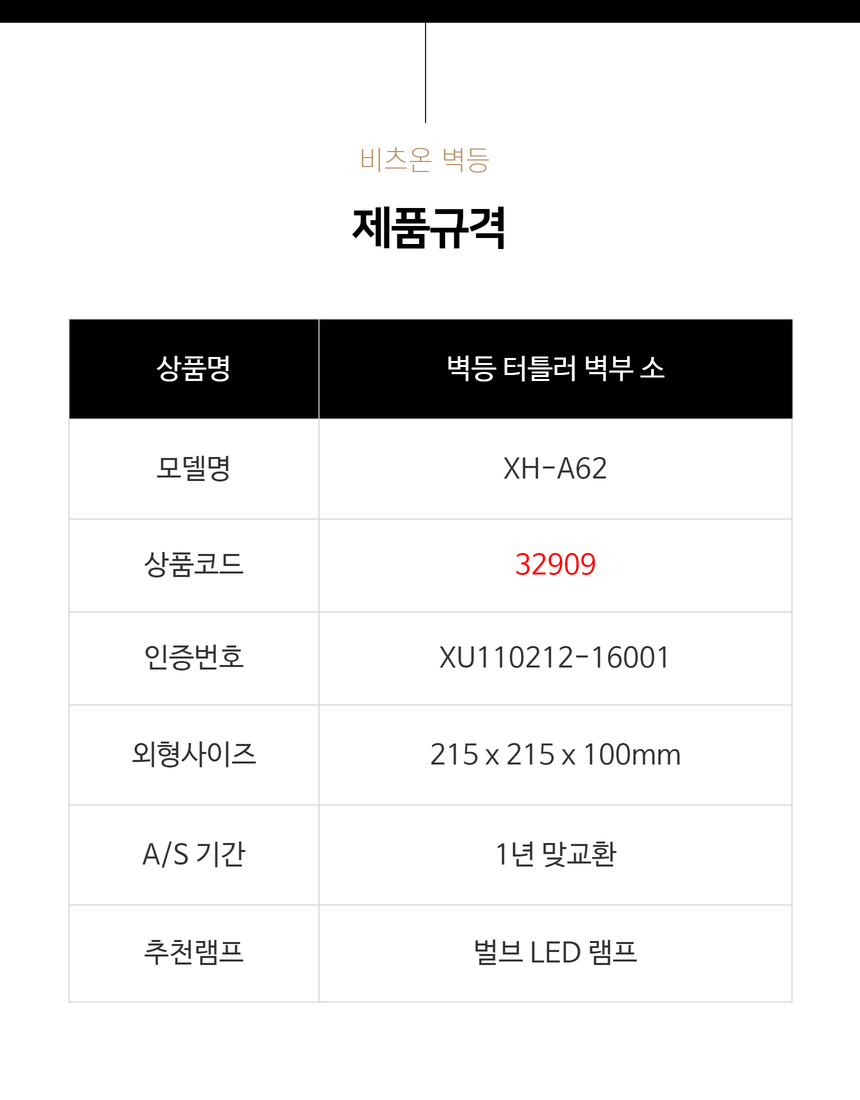 | 품명 및 모델명 | 벽등 터틀러 / 벽부 소 |