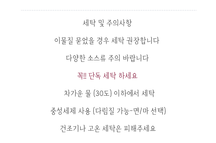 반품/교환에 관한 일반적인 사항은 판매자 제시사항보다 관계법령이 우선합니다. 반품배송비 : 편도 4,000원 교환배송비 : 왕복 8,000원 반품/교환 사유에 따른 요청 가능 기간 반품 시 먼저 판매자와 연락하셔서 반품사유, 택배사, 배송비, 반품지 주소 등을 협의하신 후 반품상품을 발송해 주시기 바랍니다. 구매자 단순변심 : 상품 수령 후 7일 이내 (구매자 반품배송비 부담) 표시/광고와 상이, 상품하자 : 상품 수령 후 3개월 이내 혹은 표시/광고와 다른 사실을 안 날로부터 30일 이내 (판매자 반품배송비 부담) 둘 중 하나 경과 시 반품/교환 불가 반품/교환 불가능 사유 아래와 같은 경우 반품/교환이 불가능합니다. 1. 반품요청기간이 지난 경우 2. 구매자의 책임 있는 사유로 상품 등이 멸실 또는 훼손된 경우(단, 상품의 내용을 확인하기 위하여 포장 등을 훼손한 경우는 제외) 3. 구매자의 책임있는 사유로 포장이 훼손되어 상품 가치가 현저히 상실된 경우 (예: 식품, 화장품, 향수류, 음반 등) 4. 구매자의 사용 또는 일부 소비에 의하여 상품의 가치가 현저히 감소한 경우 (라벨이 떨어진 의류 또는 태그가 떨어진 명품관 상품인 경우) 5. 시간의 경과에 의하여 재판매가 곤란할 정도로 상품 등의 가치가 현저히 감소한 경우 6. 고객의 요청사항에 맞춰 제작에 들어가는 맞춤제작상품의 경우 (판매자에게 회복불가능한 손해가 예상되고, 그러한 예정으로 청약철회권 행사가 불가하다는 사실을 서면 동의 받은 경우) 7. 복제가 가능한 상품 등의 포장을 훼손한 경우 (CD/DVD/GAME/도서의 경우 포장 개봉 시)