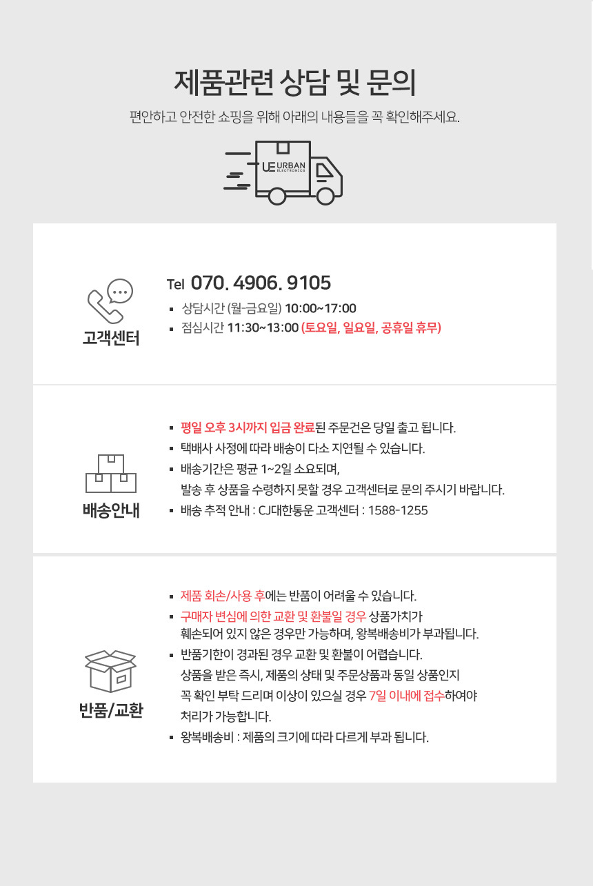 반품/교환에 관한 일반적인 사항은 판매자 제시사항보다 관계법령이 우선합니다. 반품배송비 : 편도 3,000원 교환배송비 : 왕복 6,000원 반품/교환 사유에 따른 요청 가능 기간 반품 시 먼저 판매자와 연락하셔서 반품사유, 택배사, 배송비, 반품지 주소 등을 협의하신 후 반품상품을 발송해 주시기 바랍니다. 구매자 단순변심 : 상품 수령 후 7일 이내 (구매자 반품배송비 부담) 표시/광고와 상이, 상품하자 : 상품 수령 후 3개월 이내 혹은 표시/광고와 다른 사실을 안 날로부터 30일 이내 (판매자 반품배송비 부담) 둘 중 하나 경과 시 반품/교환 불가 반품/교환 불가능 사유 아래와 같은 경우 반품/교환이 불가능합니다. 1. 반품요청기간이 지난 경우 2. 구매자의 책임 있는 사유로 상품 등이 멸실 또는 훼손된 경우(단, 상품의 내용을 확인하기 위하여 포장 등을 훼손한 경우는 제외) 3. 구매자의 책임있는 사유로 포장이 훼손되어 상품 가치가 현저히 상실된 경우 (예: 식품, 화장품, 향수류, 음반 등) 4. 구매자의 사용 또는 일부 소비에 의하여 상품의 가치가 현저히 감소한 경우 (라벨이 떨어진 의류 또는 태그가 떨어진 명품관 상품인 경우) 5. 시간의 경과에 의하여 재판매가 곤란할 정도로 상품 등의 가치가 현저히 감소한 경우 6. 고객의 요청사항에 맞춰 제작에 들어가는 맞춤제작상품의 경우 (판매자에게 회복불가능한 손해가 예상되고, 그러한 예정으로 청약철회권 행사가 불가하다는 사실을 서면 동의 받은 경우) 7. 복제가 가능한 상품 등의 포장을 훼손한 경우 (CD/DVD/GAME/도서의 경우 포장 개봉 시)