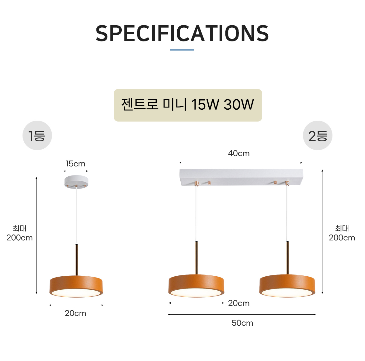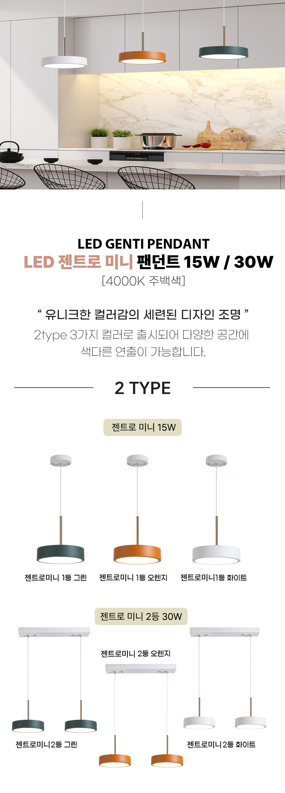 LED 젠트로 미니 펜던트 주방등 15W/2등 30W 원형등 식탁조명 식탁엣지등 공간조명 팬던트 화이트 오렌지