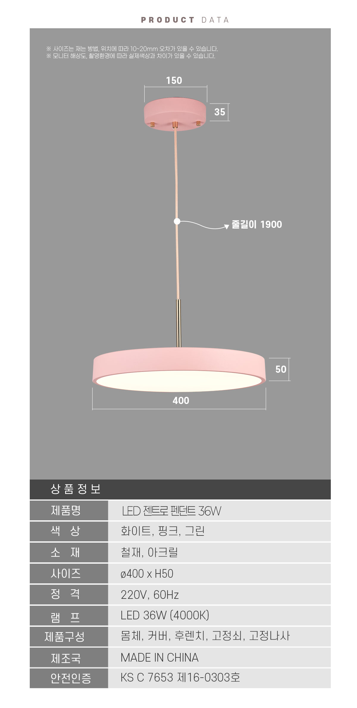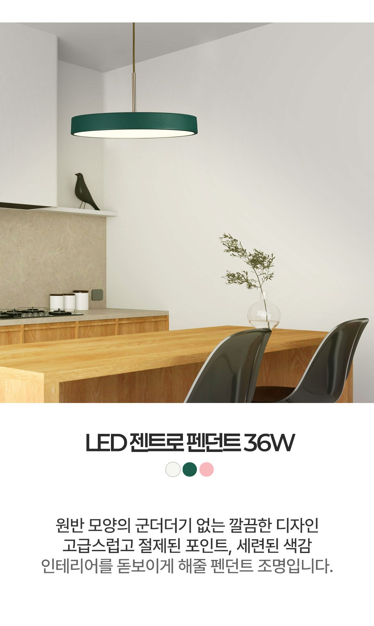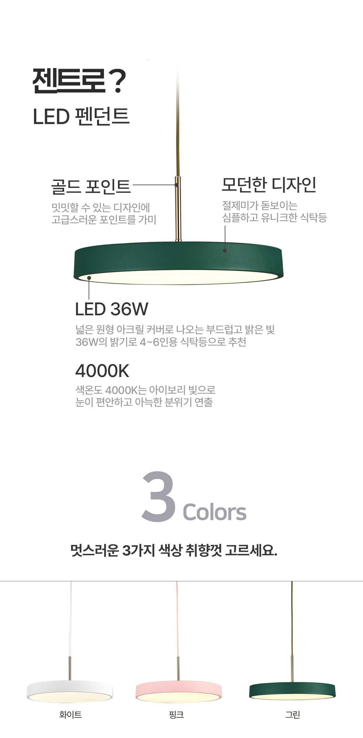 LED 젠트로 펜던트 주방등 36W 식탁조명 원형등 주방조명 포인트조명 화이트 핑크 그린