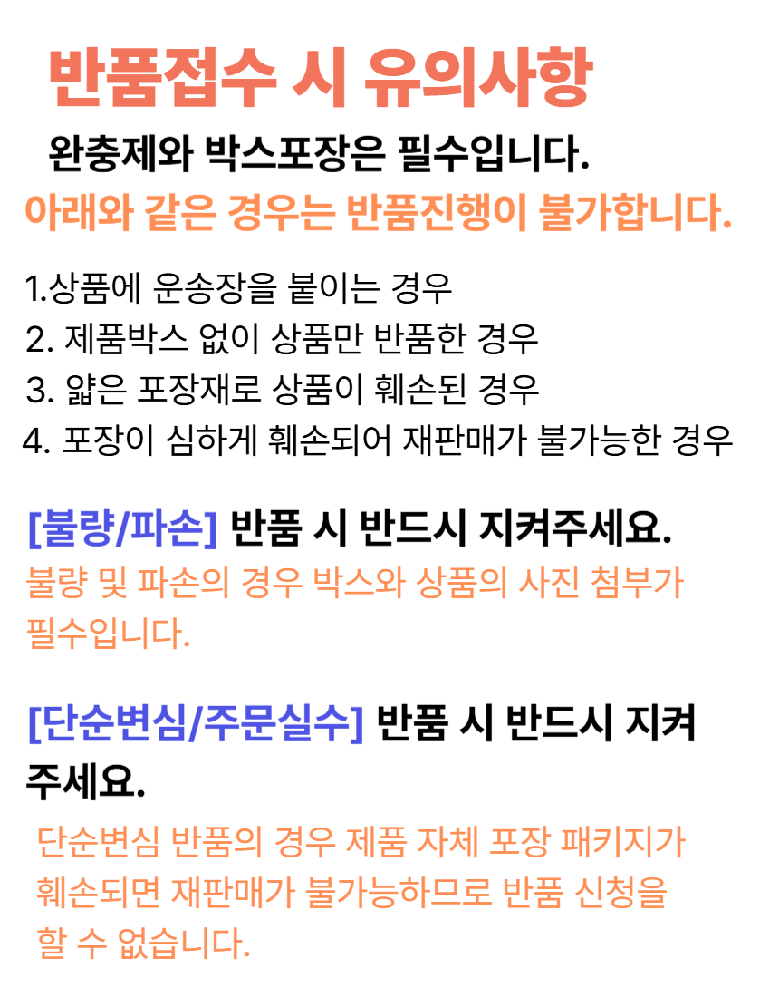 구매자 단순변심 : 상품 수령 후 7일 이내 (구매자 반품배송비 부담)