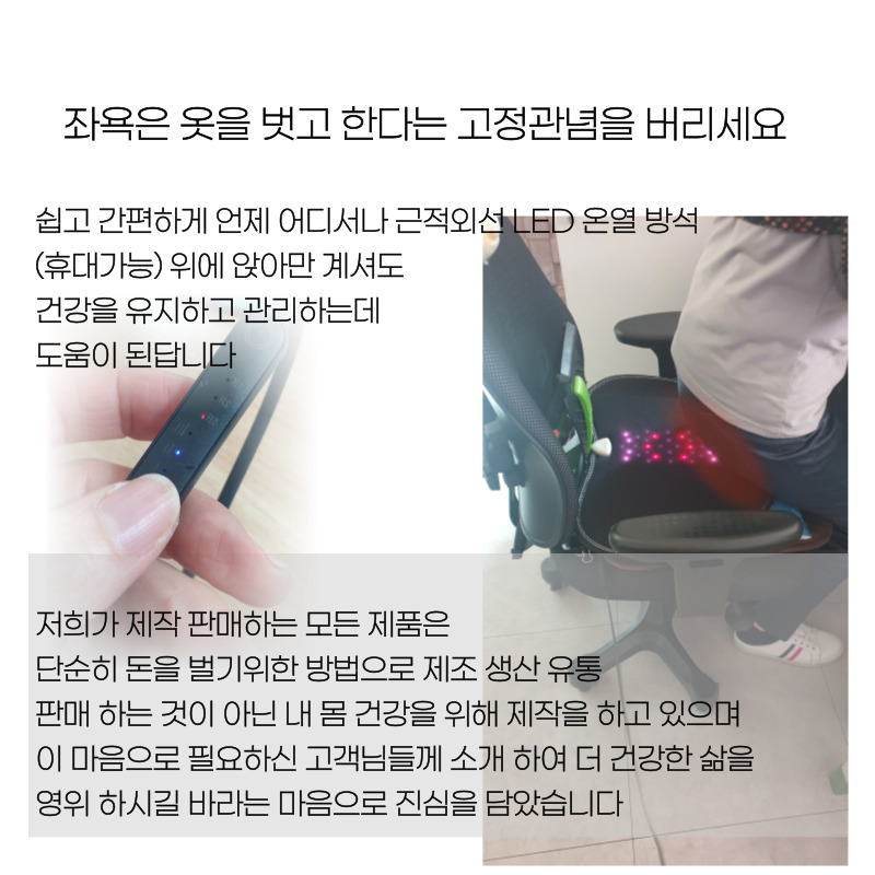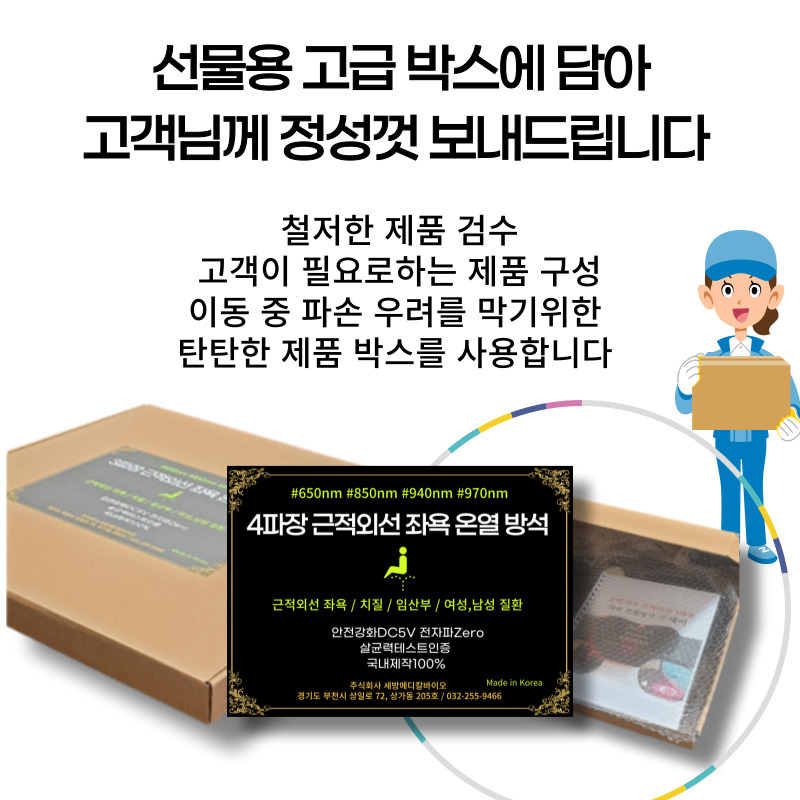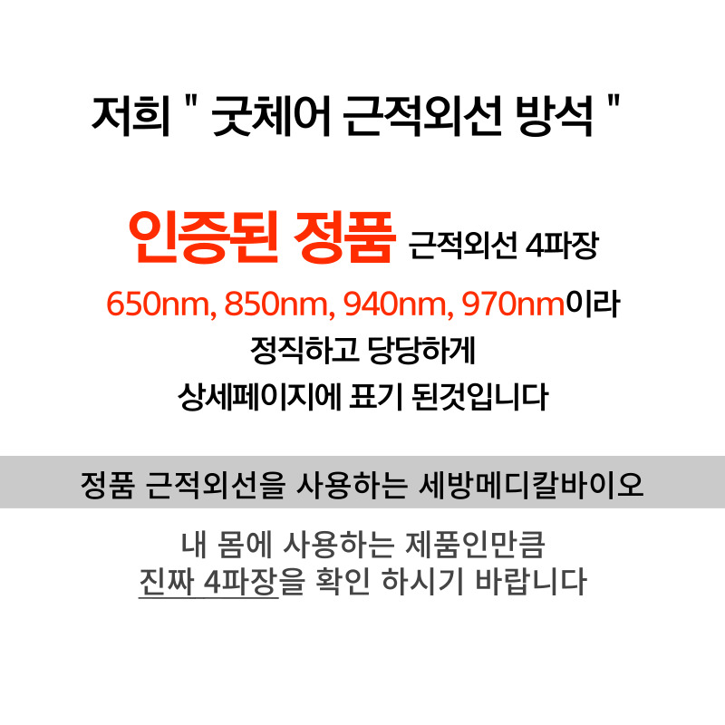 인증된 정품만이 근적외선의 효력과 효능이 있습니다. 적지않은 금액으로 구입하신만큼 건강에 더 큰 도움을 드리겠습니다. |