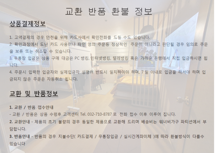 반품/교환에 관한 일반적인 사항은 판매자 제시사항보다 관계법령이 우선합니다.